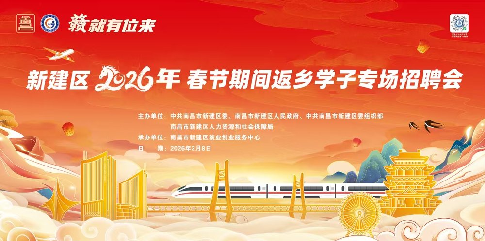 为深入实施人才强市战略,围绕“每年吸引10万名大学生和技能人才来昌留昌创业就业”目标,依据(洪人社发[2026]3号)《关于开展2026年春节期间返乡学子“五个一”对接活动的通知》文件精神,经研究,决定开展:新建区2026年春节期间返乡学子专场招聘会。